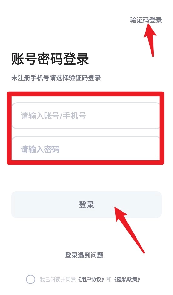 1. 输入账号或手机号与密码即可完成登录,若尚未注册,可点击右上角切换至验证码登录模式。