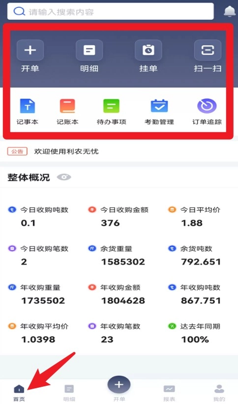 3.首页功能区支持快速开单、查看明细、挂单以及扫码操作,便于采购信息的管理。