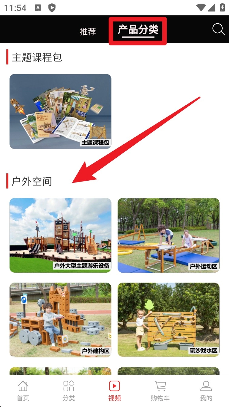 在视频页面的产品分类板块中,园所可以查看课程包和户外教具,以此辅助规划整体的采购方向。