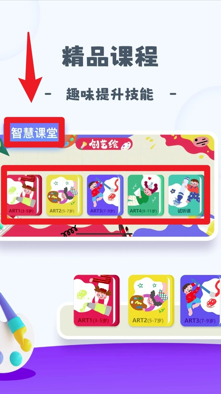 2. 登录成功后进入“智慧课堂”界面,依据年龄段挑选合适的绘画课程,随后开启学习操作。