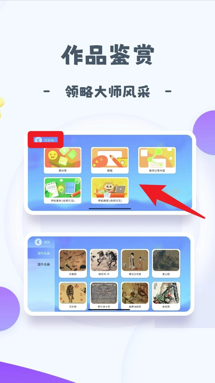 4. 切换到“云空间”的作品鉴赏区域,就能浏览大师作品范例以及老师上传的优秀作品参考内容。