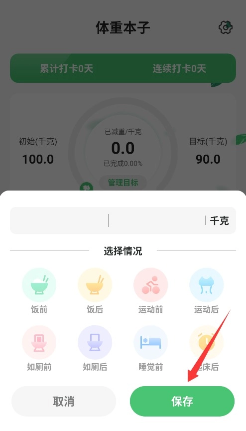 3、点开体重记录详情,选择饭前饭后、运动前后等,输入实时体重数据后点击保存完成记录。