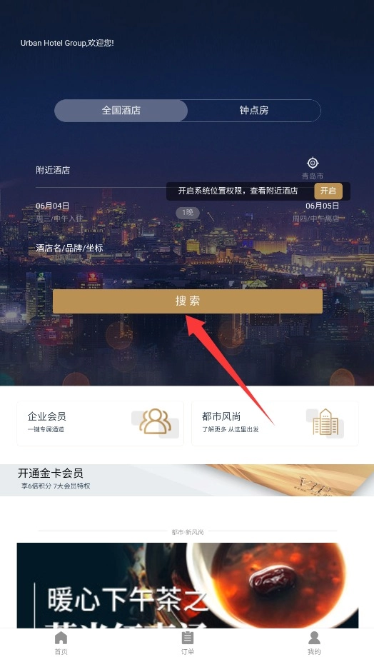 3、打开手机定位功能后,在首页搜索栏输入想要查找的酒店或区域,筛选出合适的房型,就能在线完成预订和下单操作。
