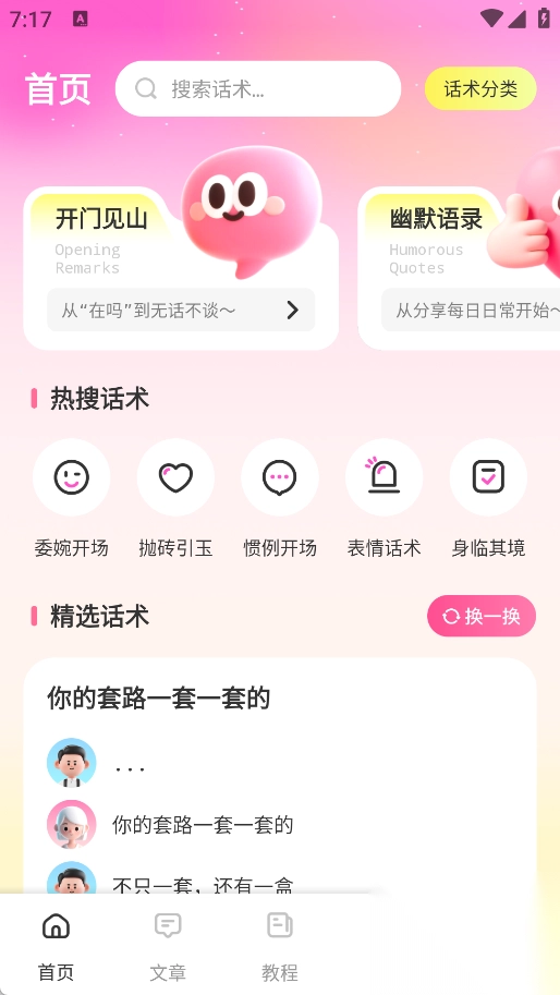 首页设有开门见山、幽默语录等版块,同时包含热搜话术与精选话术内容。
