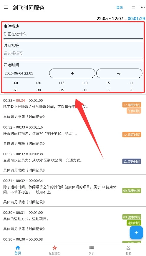 进入首页后,填写时间记录的描述内容,选择对应的分类标签,设置好起始时间,点击开始按钮,就能启动时间追踪统计功能了。