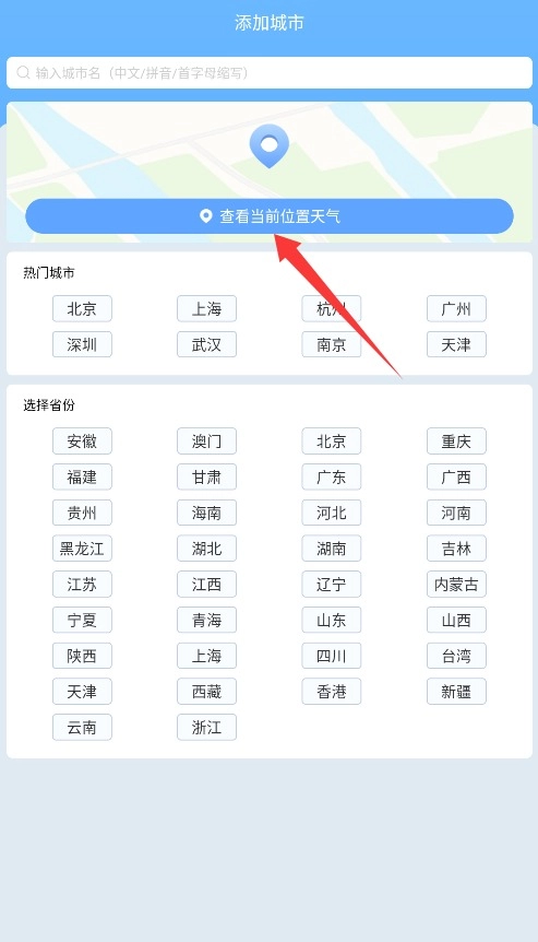 1、首次使用时需要开启位置访问权限,系统会自动定位当前所在城市,同时也支持手动输入其他城市进行查询。