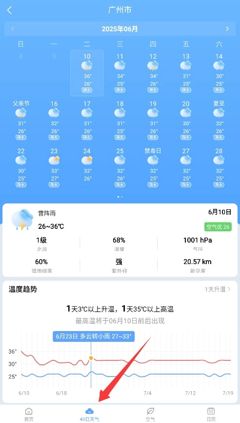 3、借助长期预报功能,能够查看未来40天的天气走向,涵盖温度变动以及降水概率的预估。