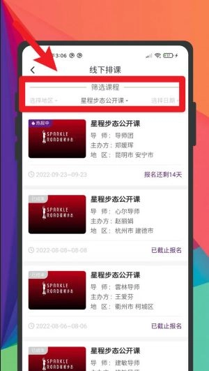 2、进入“线下排课”界面后,选定课程类型和所在城市,就能查看公开课的具体信息,接着挑选合适的日期完成报名并参与。