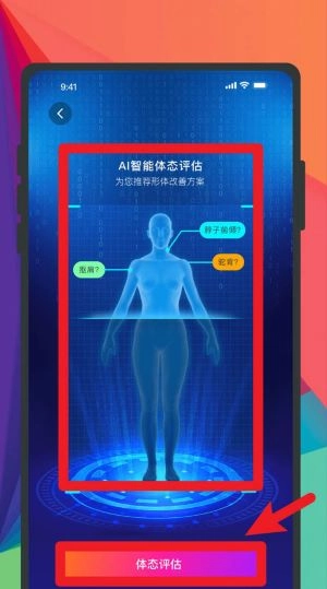 4、点击“体态评估”进入AI智能分析界面后,系统会自动扫描身体姿态,并生成相应的改善建议方案。
