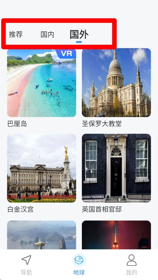 4、在地球页面,用户能够借助顶部的切换标签,查看推荐、国内以及国外景点的分类内容。