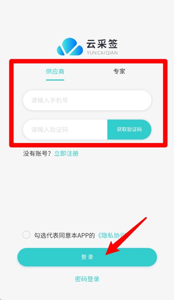 1. 于登录页面挑选“供应商”或“专家”身份选项,输入手机号码以获取验证码,随后点击登录按钮即可进入系统。