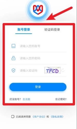 1、打开应用进入登录页面,可选择“账号登录”或“验证码登录”的方式,输入相关信息并勾选协议后,点击“登录”按钮即可。