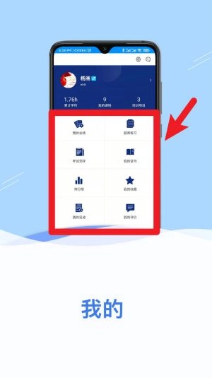 登录成功后进入“我的”页面,能查看学习时长、课程数量以及培训项目,还可以快速进入常用功能模块进行操作。