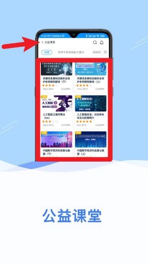 3、点击“公益课堂”,即可浏览涵盖网络安全、人工智能、数字经济等专题学习视频在内的各类精品课程内容。