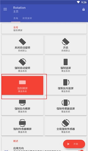 3. 接下来,如果想通过这款软件来达成强制横屏的效果,点击“强制横屏”选项之后,接着点击“开始”按钮就可以了。