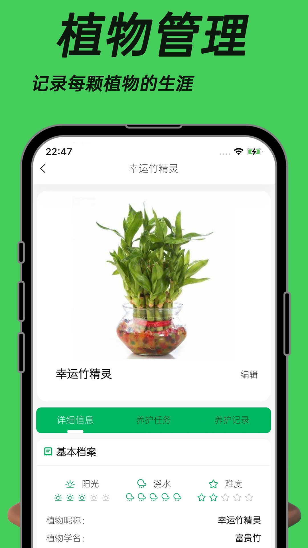 2、在植物详情页面,能够查看该植物的详细信息、养护任务以及养护记录。