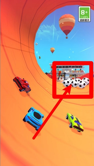 2.赛车驶入巨型U型赛道并高速滑行,赛道内设有足球障碍,需精准躲避才能通过。