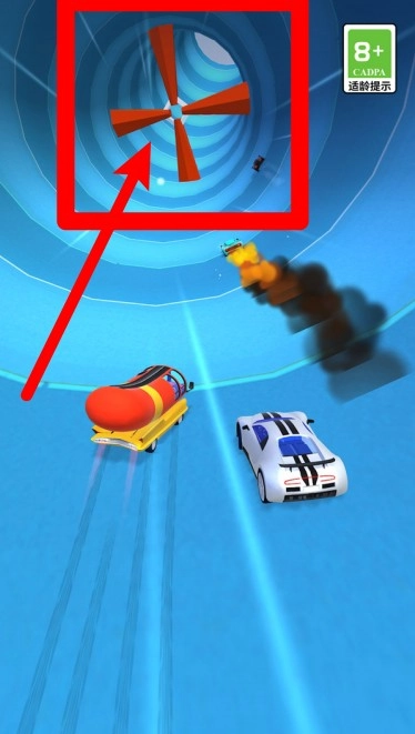 3. 疾速驶入蓝色风洞通道,前方高转速风扇机关极具挑战性,需要快速反应。