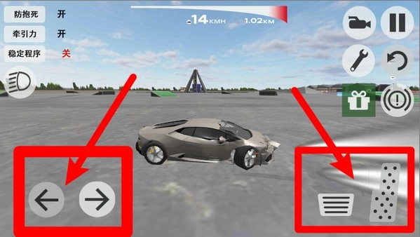 1. 左下角的左右方向按钮可控制车辆转向,右下方则是油门与刹车踏板,界面直观,操作极易上手。