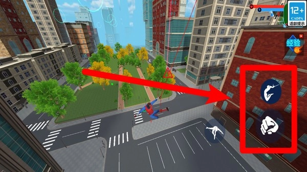 2. 点击右侧的飞索按钮,能够迅速发射蜘蛛丝,借助它在高楼间灵活穿梭,从而更快地抵达目标区域。