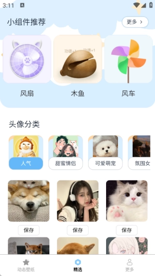 精选里包含不少精彩的头像分类,另外还有风扇、木鱼和风车之类的分类信息。