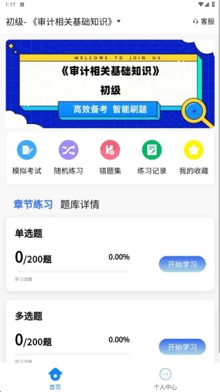 进入首页后,能够看到模拟考试、随机练习、错题集、练习记录、我的收藏等多个板块。