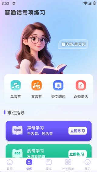 训练页面包含单音节、双音节、短文朗读、命题说话等练习内容,同时还提供难点指导信息。