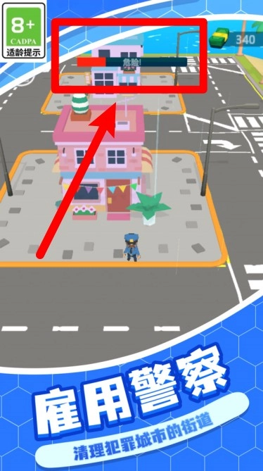 2. 当建筑物上方显示“危险!”的提示语以及红色进度条时,意味着该区域发生了犯罪事件,需要迅速安排警力前往处置。