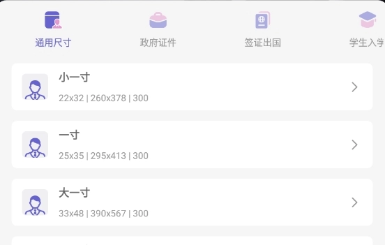 提供丰富多样的证件照尺寸选择,涵盖常见的身份证、护照、驾照、签证、一寸照、二寸照等。