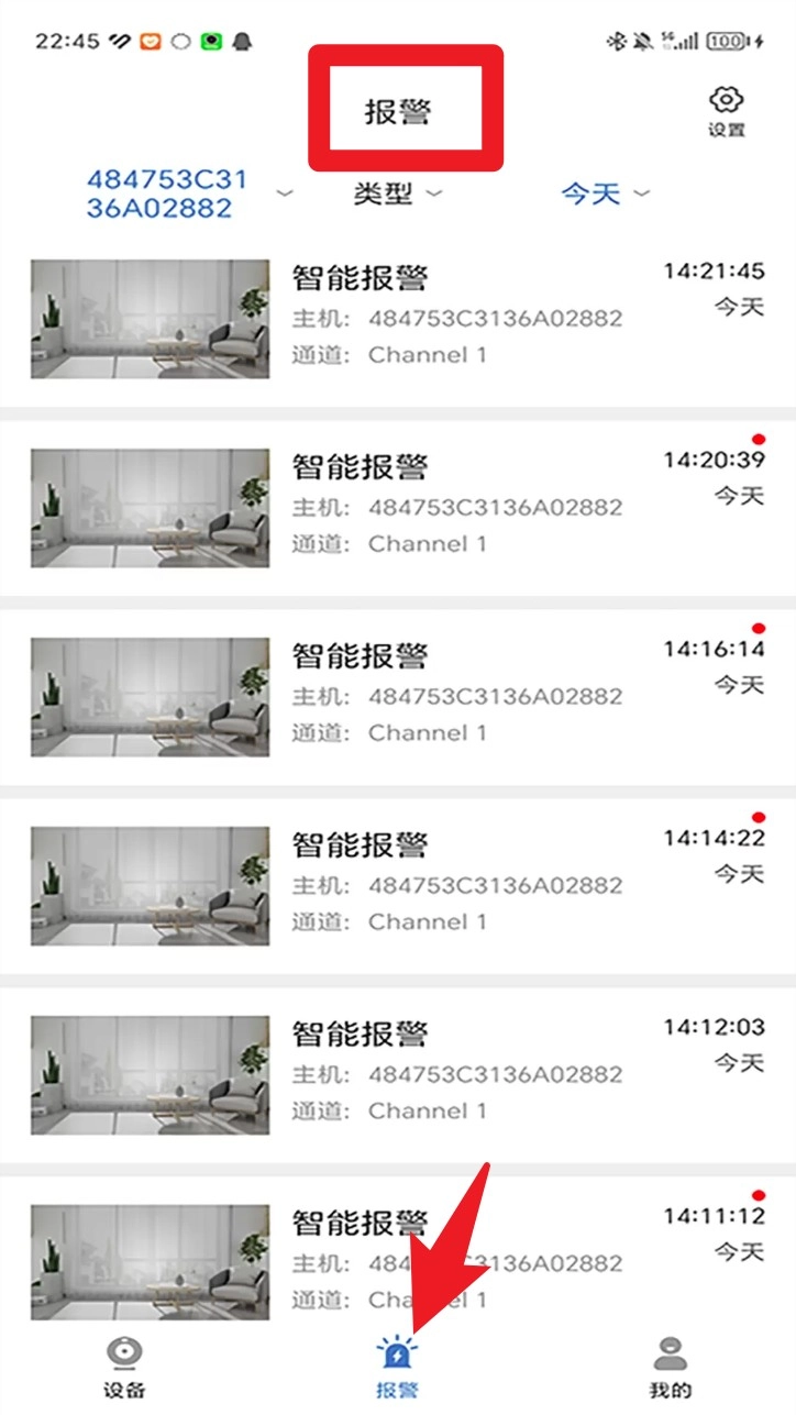 4. 切换至「报警」页面可查看当天各时间点的智能告警记录,支持查看主机通道及抓拍图。