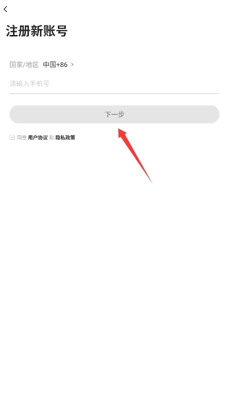 2、在注册页面输入常用手机号码,勾选同意用户协议的选项后,点击“下一步”按钮。