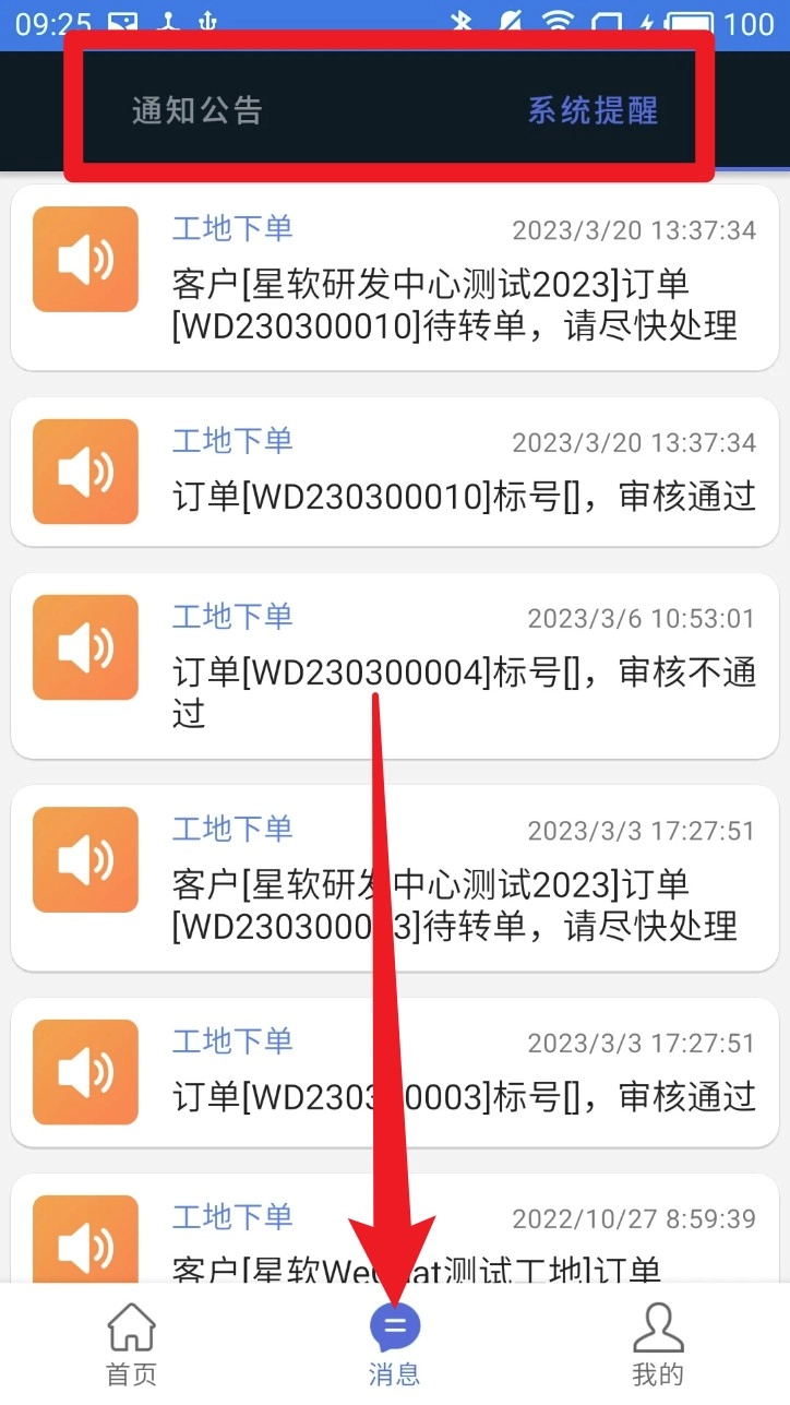 3. 点击底部的“消息”按钮进入通知中心,能够查看工地订单、系统提醒等实时更新的调度信息。