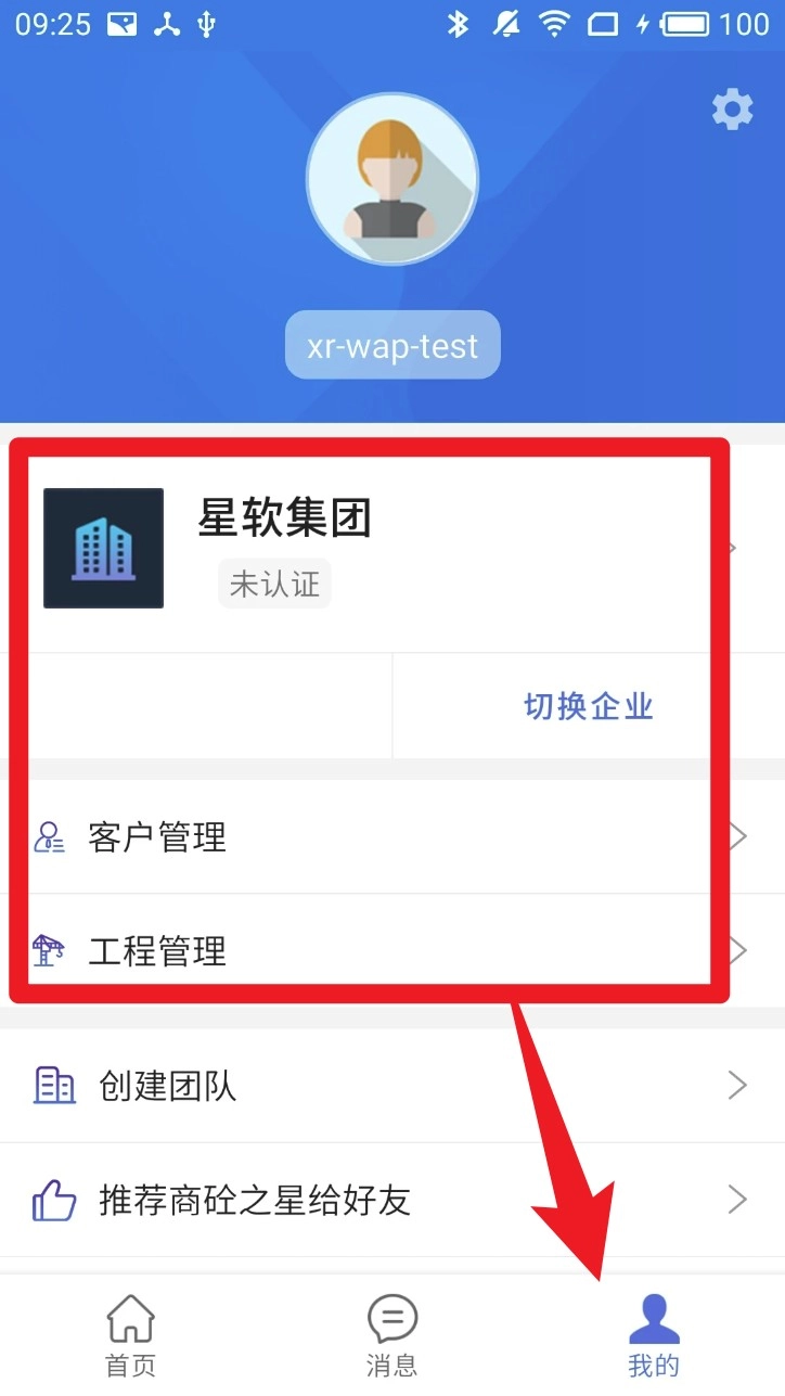 进入“我的”页面后,能够查看当前账号对应的所属企业、客户及工程管理入口,同时支持企业切换和团队创建功能。