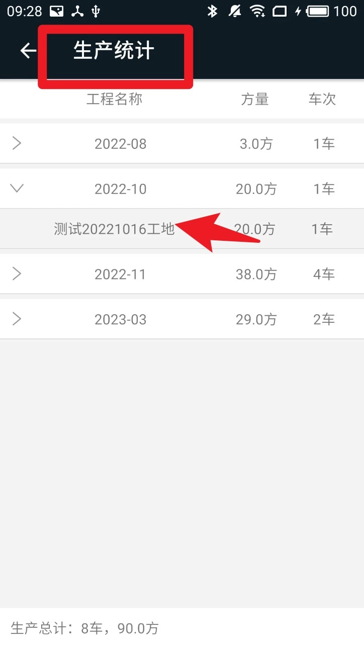 5. 在生产统计界面,可查看各项目的混凝土方量及车次数据,支持按月份展开查看,也能进行总量汇总查看。
