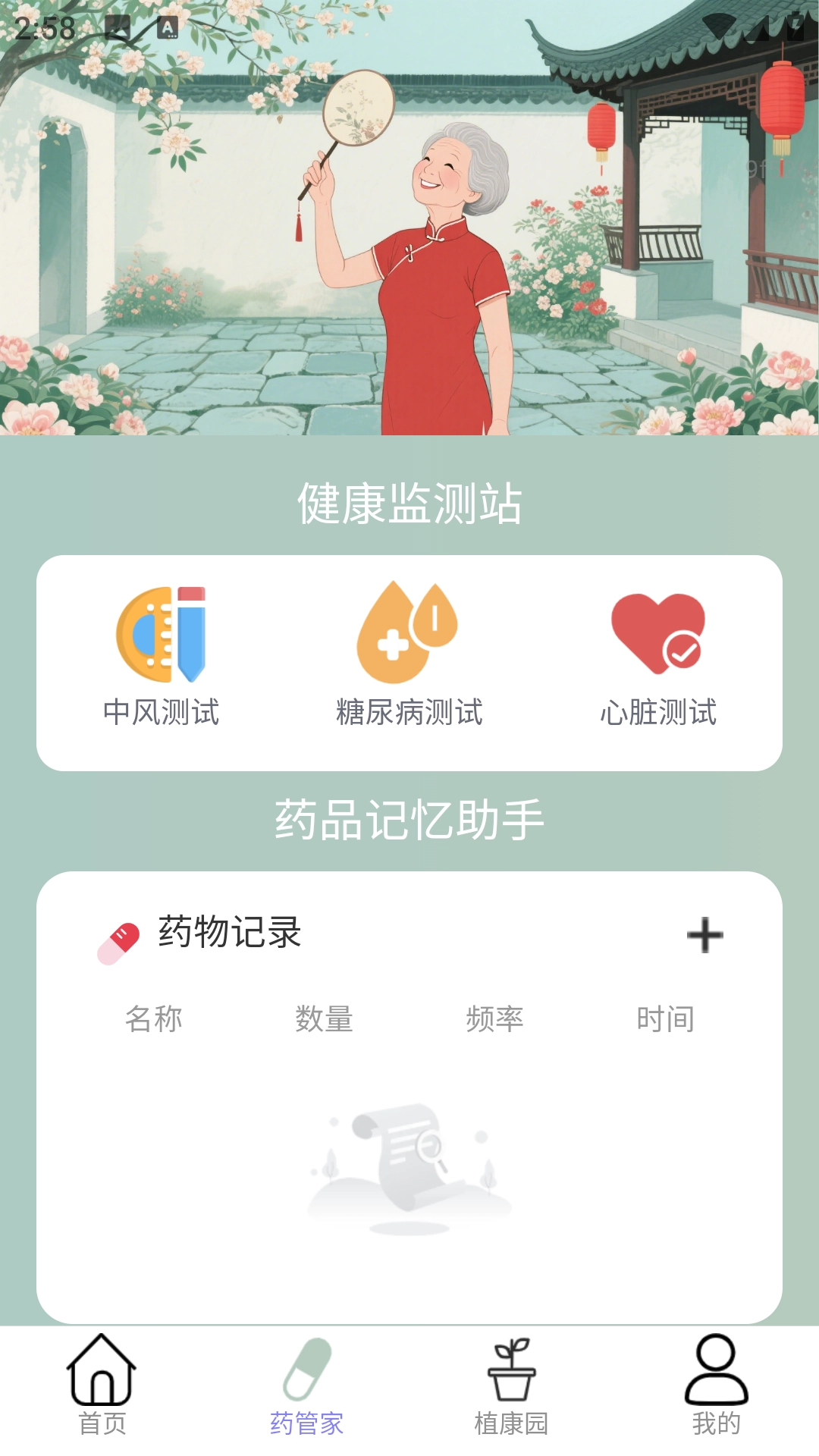 药管家板块支持添加药物记录,可录入名称、数量、使用频率等信息。