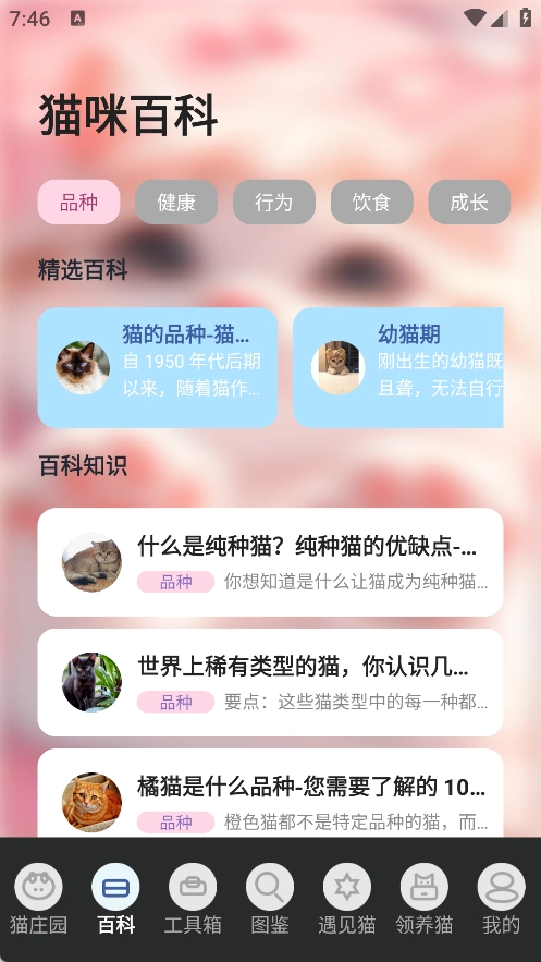在百科中能够获取有关猫咪的百科知识,这些知识主要分为精选百科与百科知识两大类别。