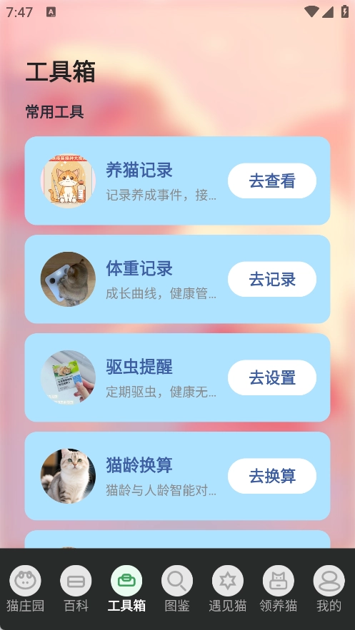 在工具箱页面,你可以使用养猫记录、体重记录、驱虫提醒以及猫龄换算等功能。