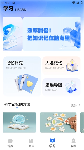 点击页面下方的“学习”按钮,就能看到记忆扑克、人名记忆、思维导图等功能模块了。