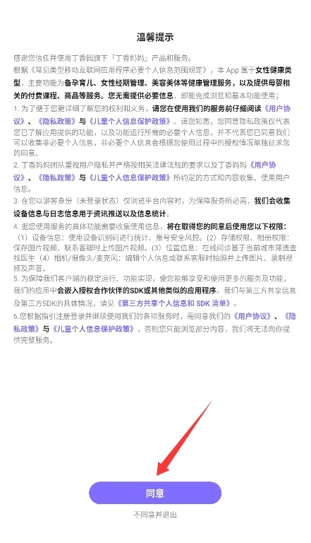 首次使用时,请仔细阅读平台的服务条款和隐私政策,确认无误后点击同意按钮,即可进入应用。