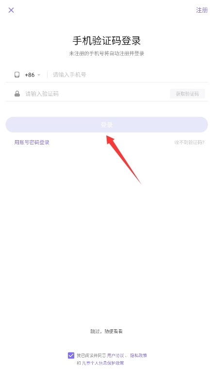 2、输入手机号后点击“获取验证码”按钮并输入收到的验证码,勾选同意相关协议,最后点击登录按钮即可进入。