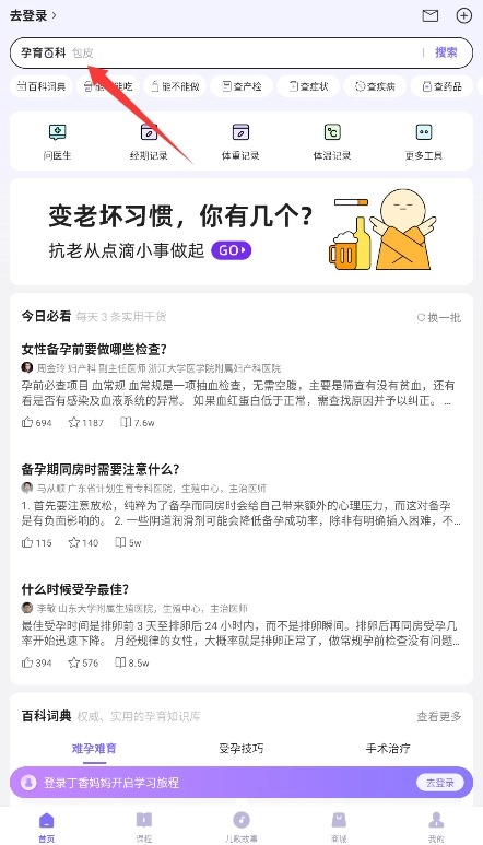 在首页的搜索框中输入与育儿相关的问题关键词,就能得到专业的解答以及实用的建议。