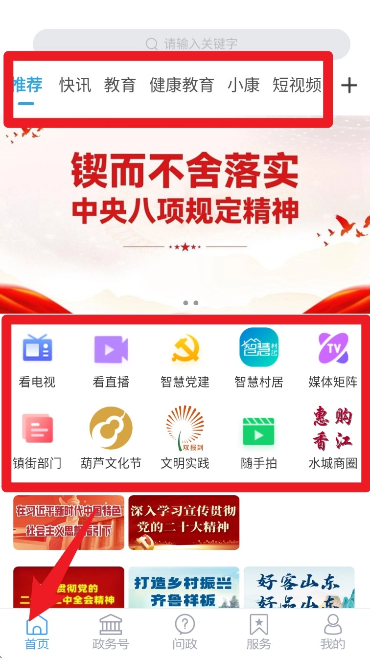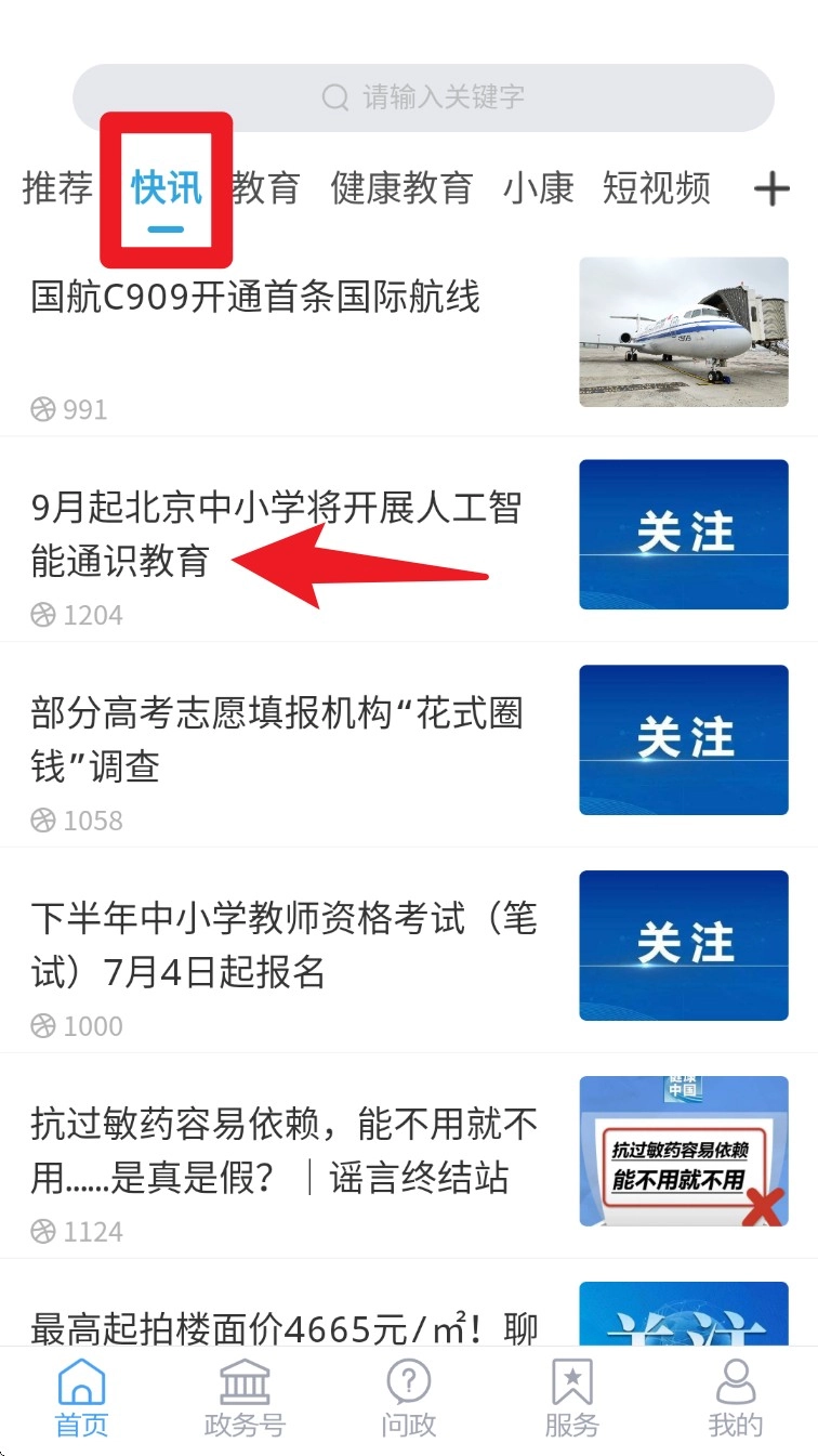 进入首页后,可点击顶部的“快讯”“教育”等分类标签,浏览各类资讯内容;也能通过下方的图标,进入电视、直播等功能区域。