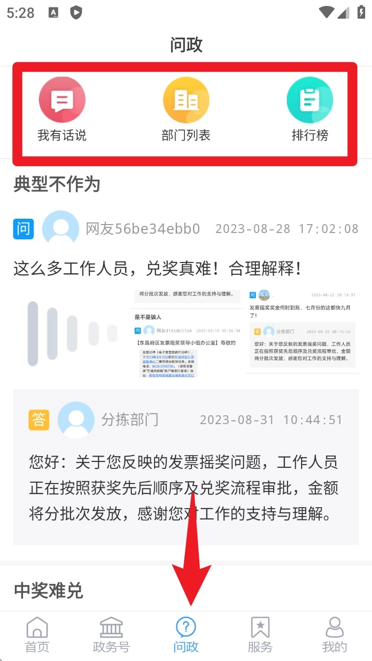 3. 点击底部导航栏中的“问政”选项,进入页面后,既可以在“我有话说”板块留言提出问题,也能够查看相关部门的回复内容以及事项的办理进度。