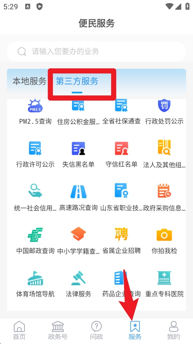 4. 进入“服务”页面后,点击顶部的“第三方服务”标签,就能看到社保、公积金、政务公开等各类便民工具。
