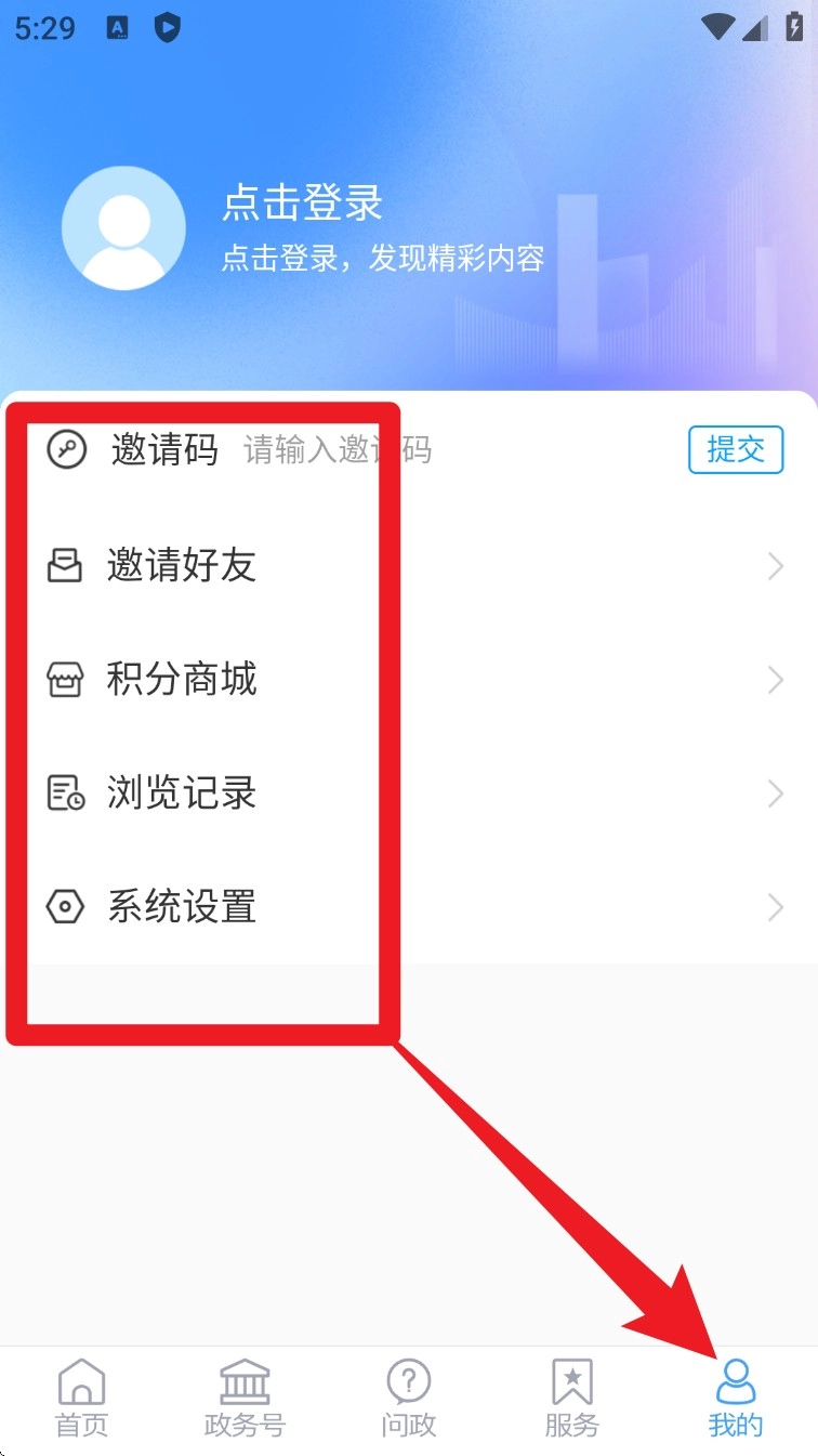 5. 进入“我的”页面,登录账号后,您可以查看浏览记录、访问积分商城、使用邀请好友等功能,同时也能对系统设置进行调整。