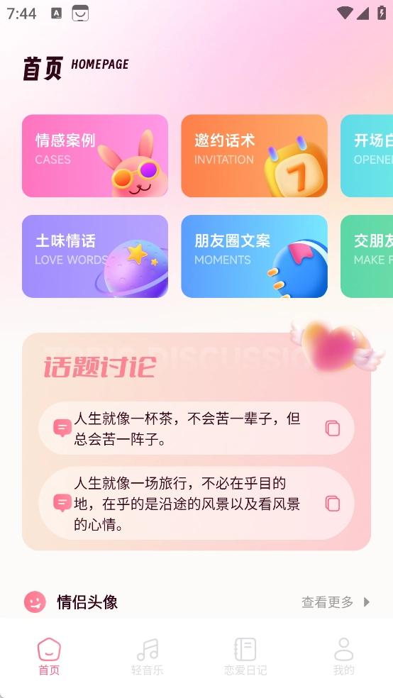 首页设有情感案例、邀约话术、开场白、土味情话、朋友圈文案及交朋友等多个版块。