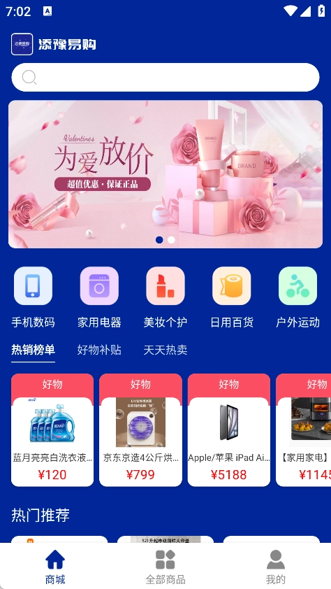 商城页面涵盖手机数码、家用电器、美妆个护、日用百货、户外运动等品类,此外还设有热销榜单与热门推荐等板块。