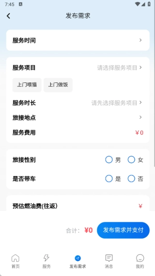 在发布需求页面,需依次选定服务时间、服务项目、服务时长、旅接地点、服务费用、旅接性别、是否带车、预估燃油费等选项,完成后点击发布需求并进行支付操作。
