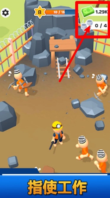 1. 矿场作业区域会展示当前拥有的金币数量以及资源上限,玩家能够点击囚犯或设施相关指令,通过分配囚犯开展采矿劳作来获得经济收益。