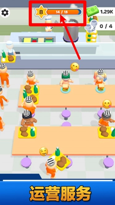 2. 在餐厅场景里,上方的经验值进度条用于显示等级成长状态,完成服务任务能够提升监狱等级,进而解锁更多区域以及功能建设。